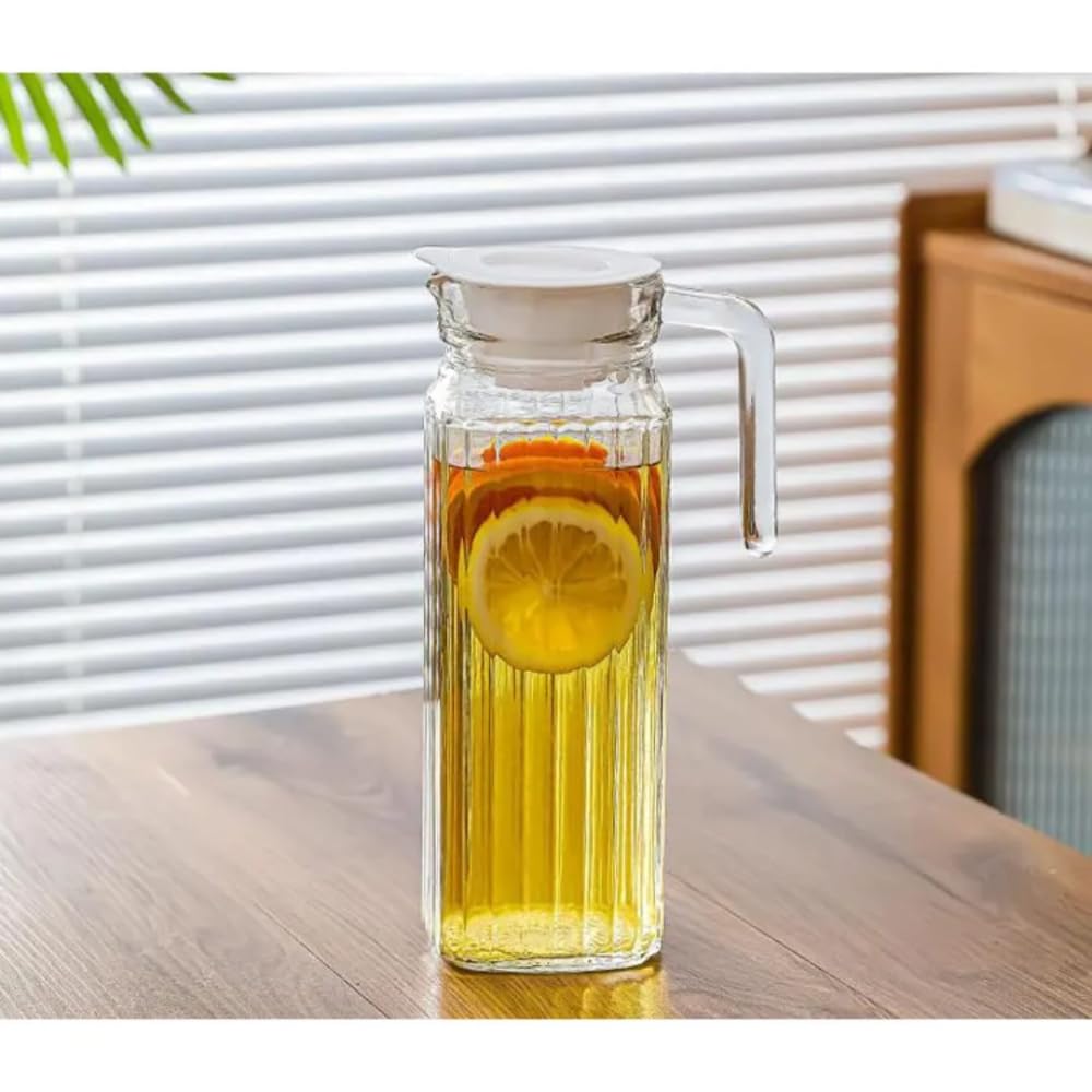 1.1L Glass Pitcher with Handle & Lid,Ribbed Soda Lime Glass Jug for Water,Juice,Iced Tea,Leak Resistant,Elegant Fridge Carafe for Home & Kitchen(Pack of 1) Jug for Dining Table (Ribbed Jug)