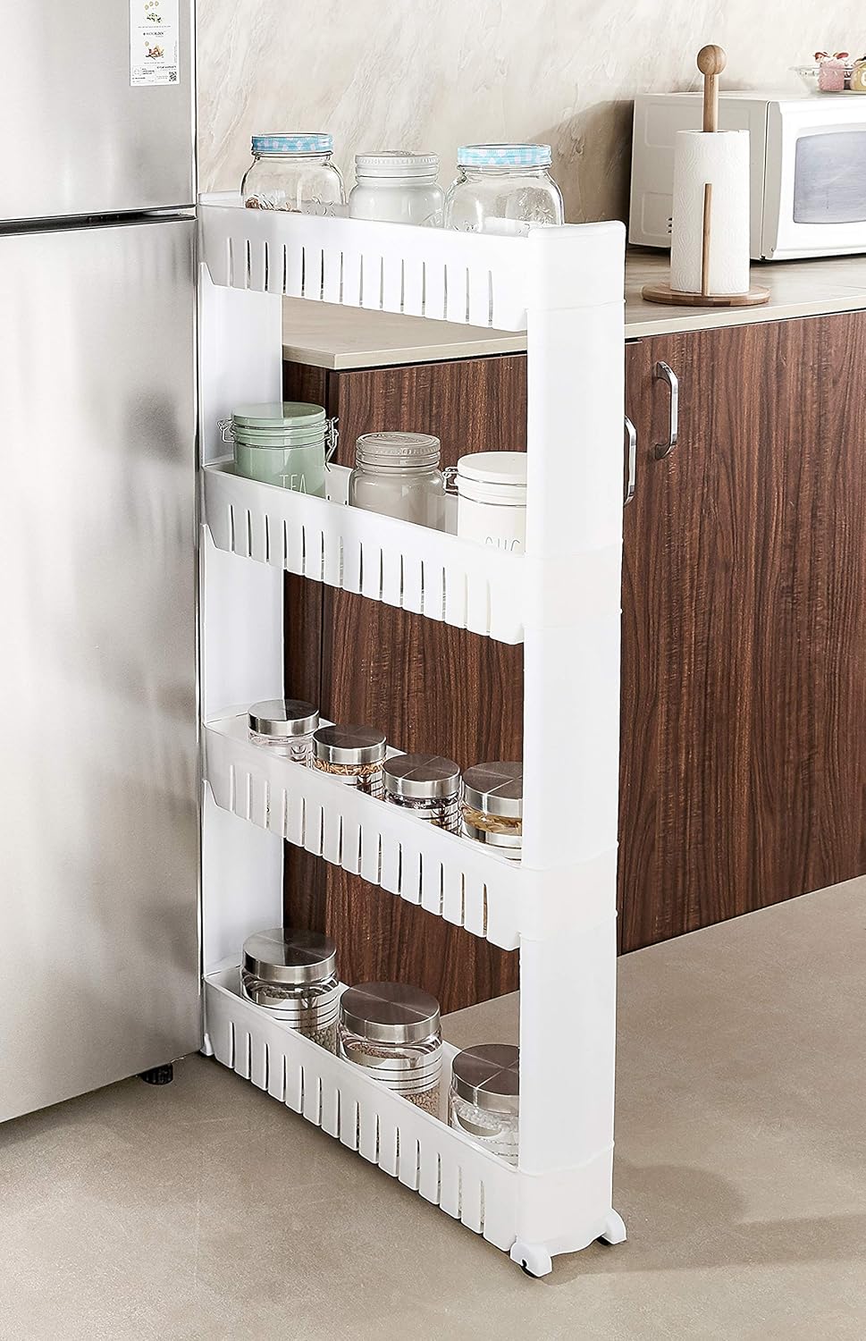 Amazon Brand – Solimo Plastic Rolling Storage Rack | 4-Tiered Shelf Slide-Out Organizer | for Kitchen, Bathroom, Pantry & Utility Storage| Space-Saving | Floor Standing Multipurpose Shelf | White