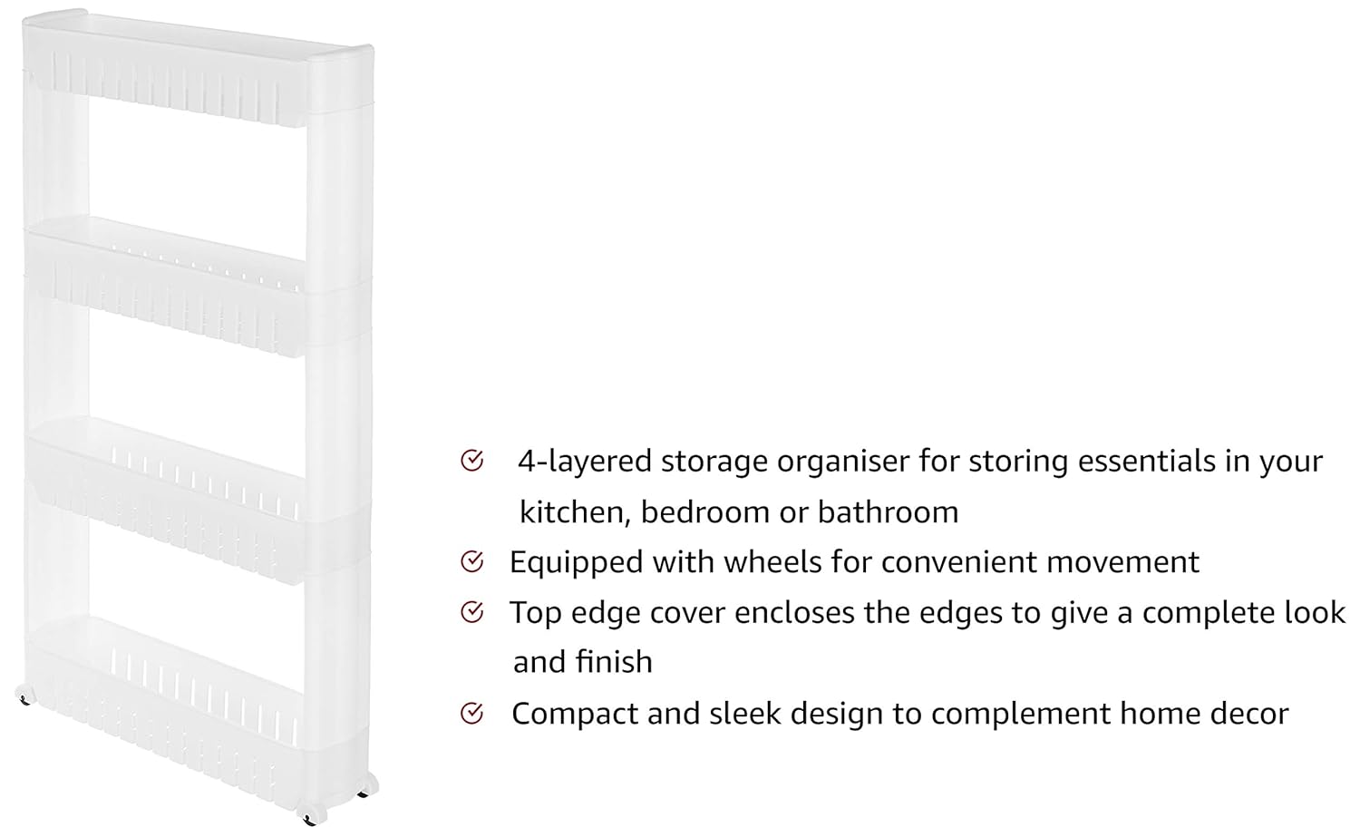 Equipped with 4 layers of storage racks, this Solimo Space Saving Storage Organiser With Wheels is ideal for storing and organising kitchen and bathroom essentials, beauty products, cleaning supplies and toiletries.