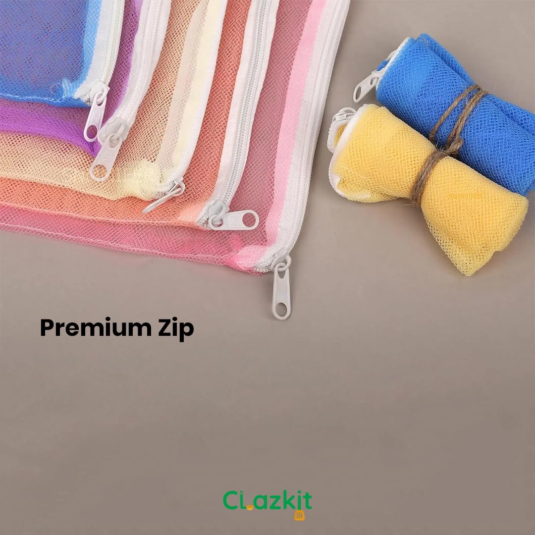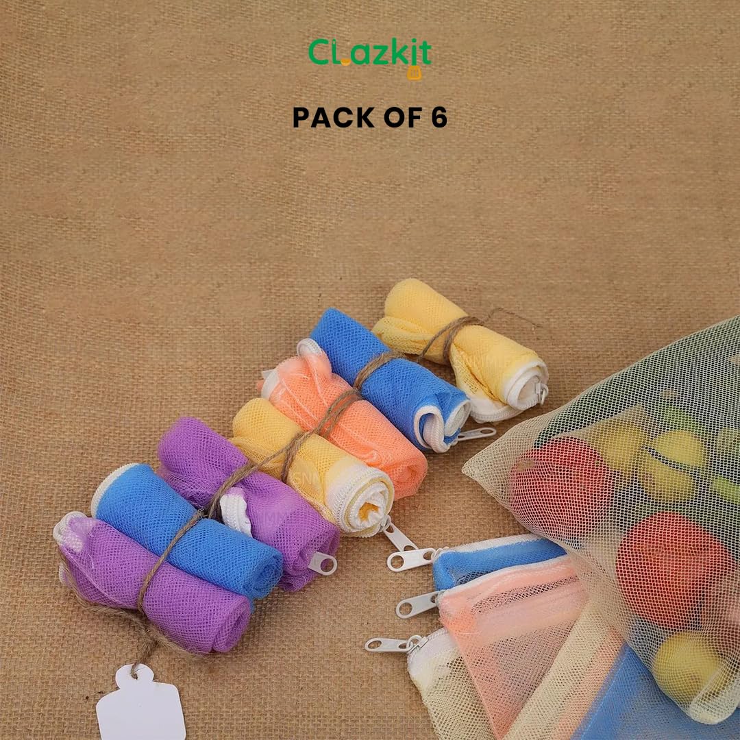 Clazkit Set Of 6 Reusable Fridge Storage Bags For Vegetables and Fruits Dual Layer Mesh Net Multipurpose Multi-Size Kitchen Storage Bags Organizer with Sturdy Zipper