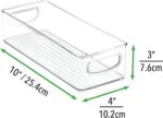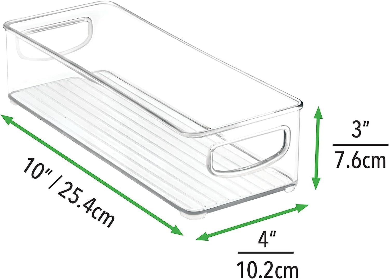 SET OF 02 : Our stackable clear storage set includes 02 refrigerator organizer bins , each measuring 10” L x 4” W x 3.0” H . Ideal sized to fit fruits, vegetables, yogurts, canned goods, food packets, cheese, meat, also good for storing dry goods in the pantry.