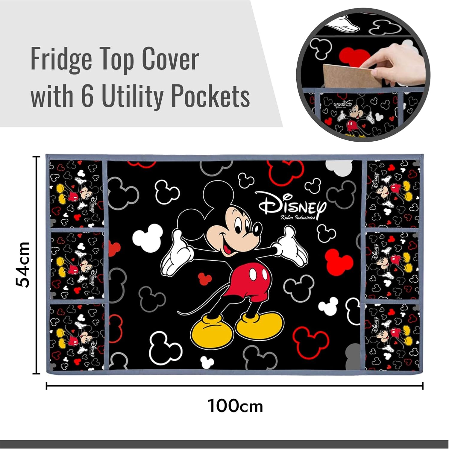 Kuber Industries Disney Mickey Fridge Top Cover | Fridge Cover with Pockets | Refrigerator Top Cover for Kitchen | Fridge Top Cover with 6 Utility Pockets | Polyester Fridge Cover | Black