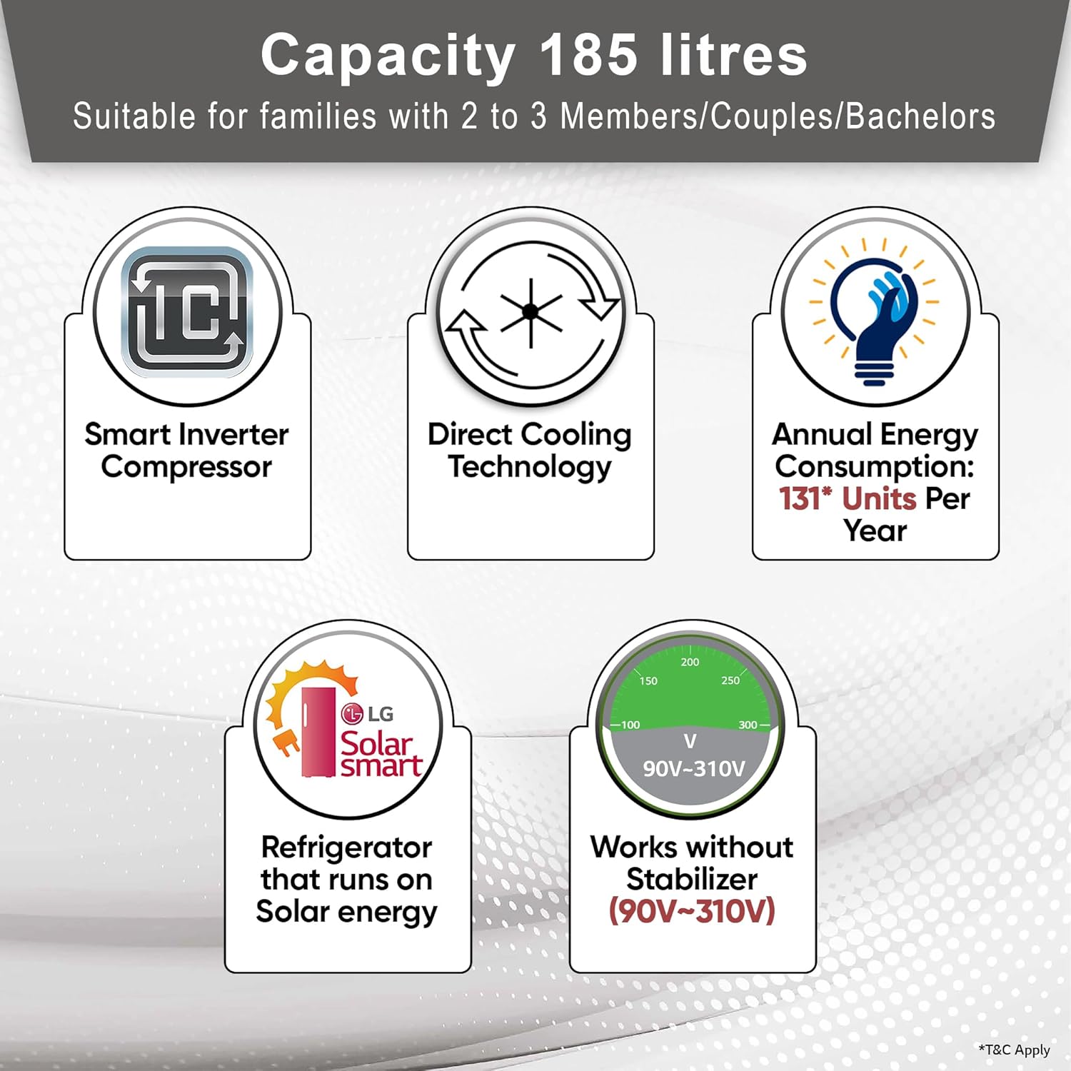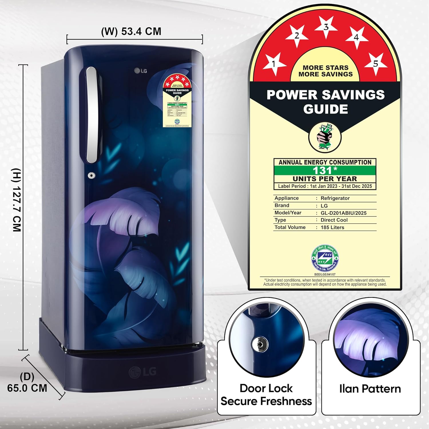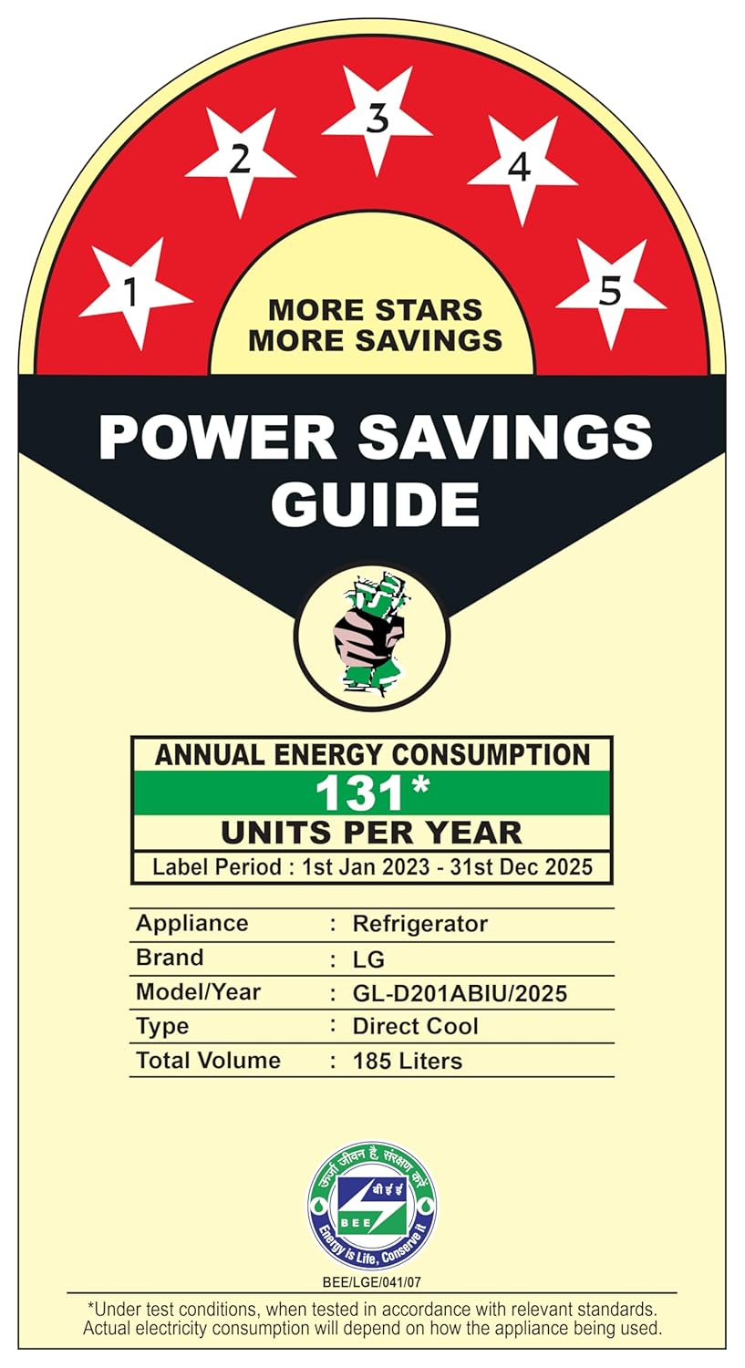 Energy Rating: 5 Stars Refrigerator – Best in class Efficiency (Higher star ratings lead to lesser electricity consumption lowering bills) | Annual energy consumption – 131 Units per year | BEE Label period – 01st Jan 2023 to 31st Dec 2025 | The revolutionary Smart Connect technology in LG Direct Cool refrigerator helps you connect your refrigerator to home inverter in case of power cuts. (T&C Apply)