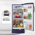 (maximum in its class). A spacious vegetable box (removable) keeps produce fresh, while the antibacterial gasket ensures hygiene. It also includes a movable ice box, 02 L bottle storage, and a base stand with drawer for dry storage (like potatoes, onions, and other root vegetables that don’t need to be chilled to stay fresh)