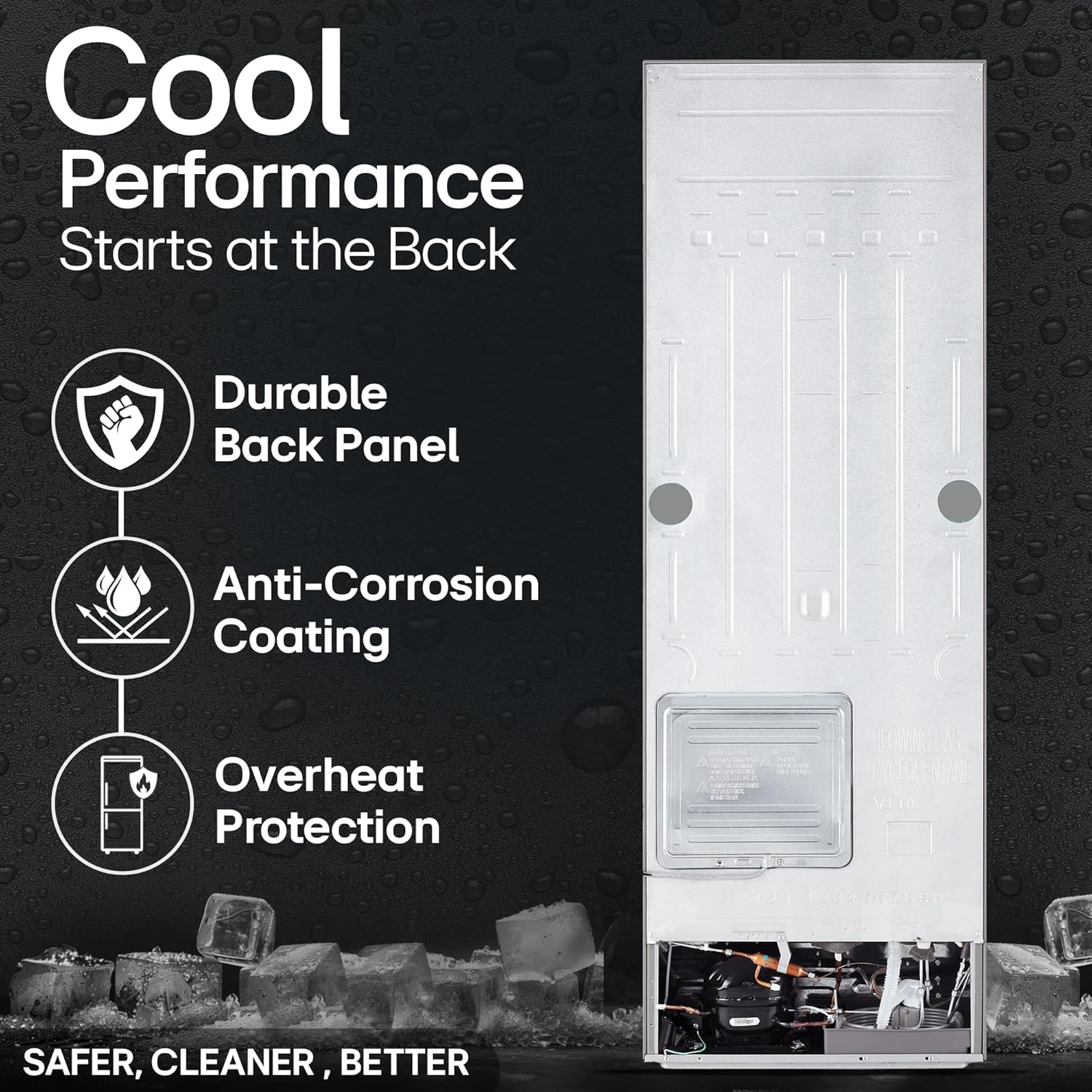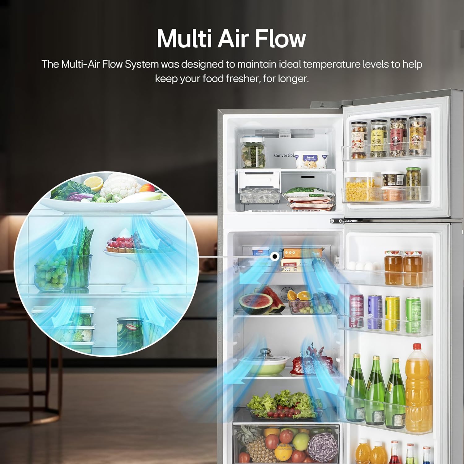 Additional Features: Multi-Air Flow cooling system- maintains optimal humidity and temperature levels so your food stays fresher for longer; Anti-Bacteria Gasket: prevents the entry and build-up of fungi and bacteria inside the refrigerator; Works Without Stabilizer (100~310V); Handle Type- Pocket