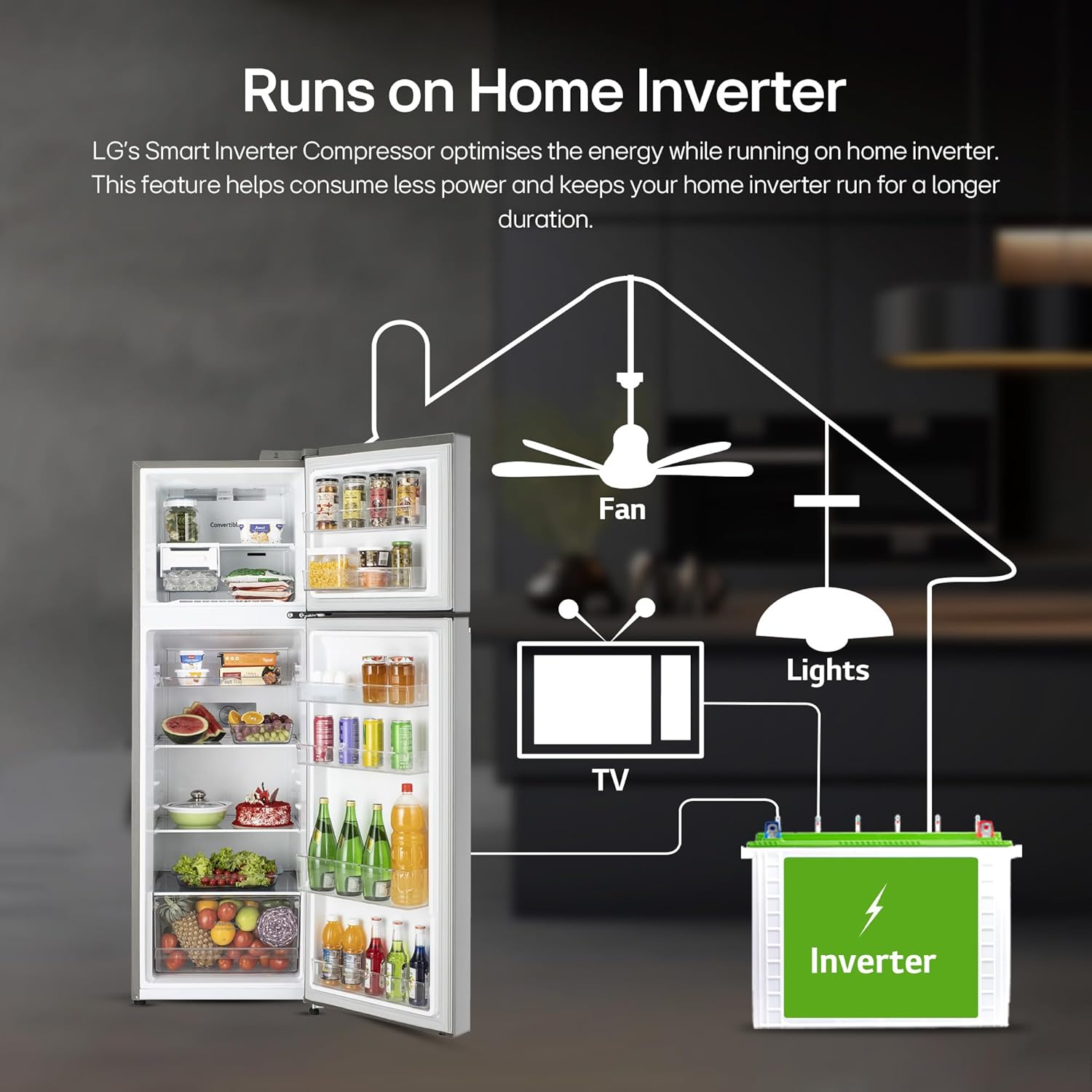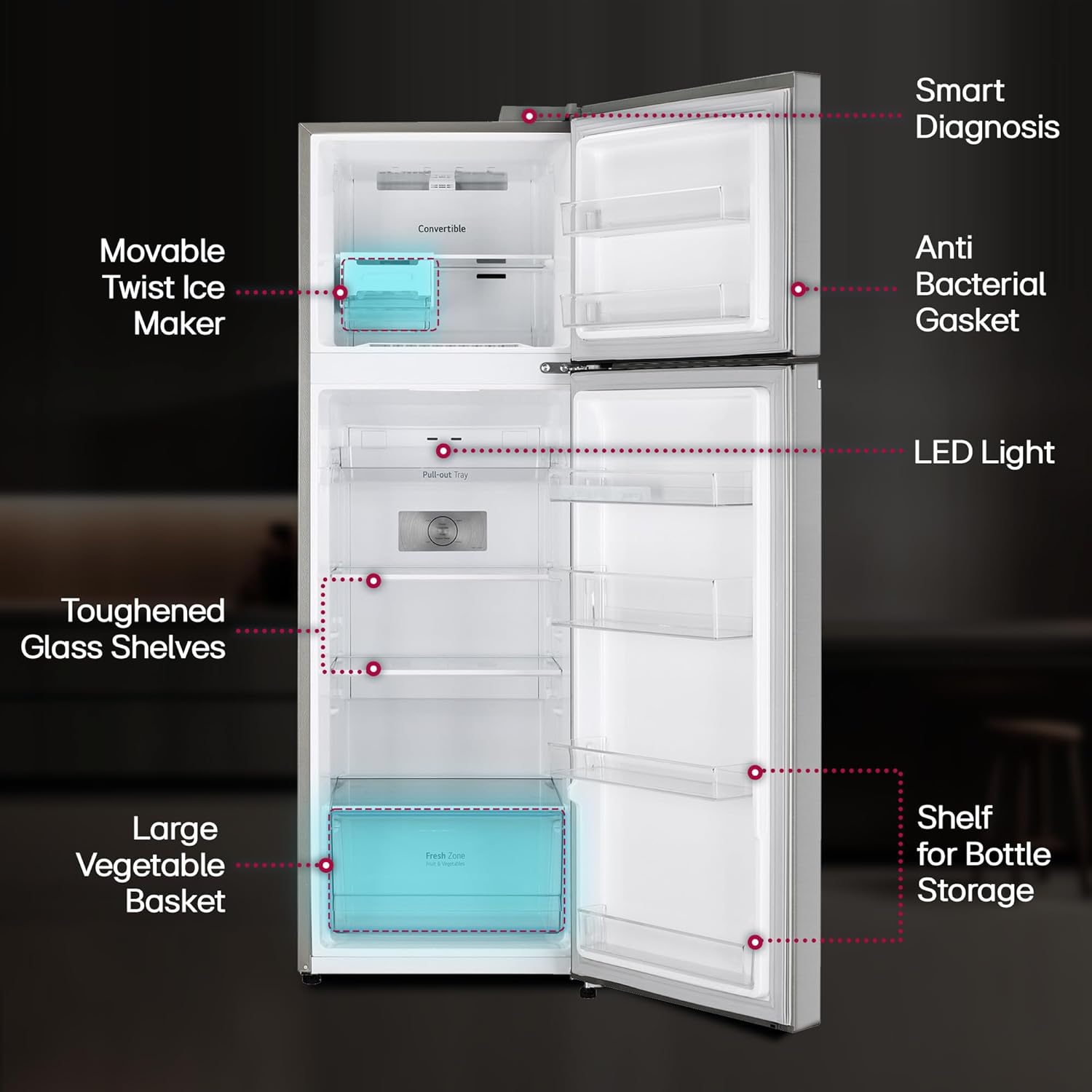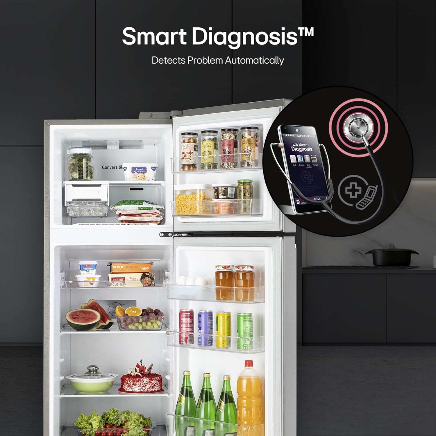 LG Exclusive Features: Offers you more space to suit your needs; Convertible- to convert and control two compartments of the double door refrigerator; Express Freeze- increases both the amount of ice made and freezing capabilities; Smart diagnosis- is a fast and easy way to troubleshoot issues; Smart Connect- helps connect your double door refrigerator to home inverter