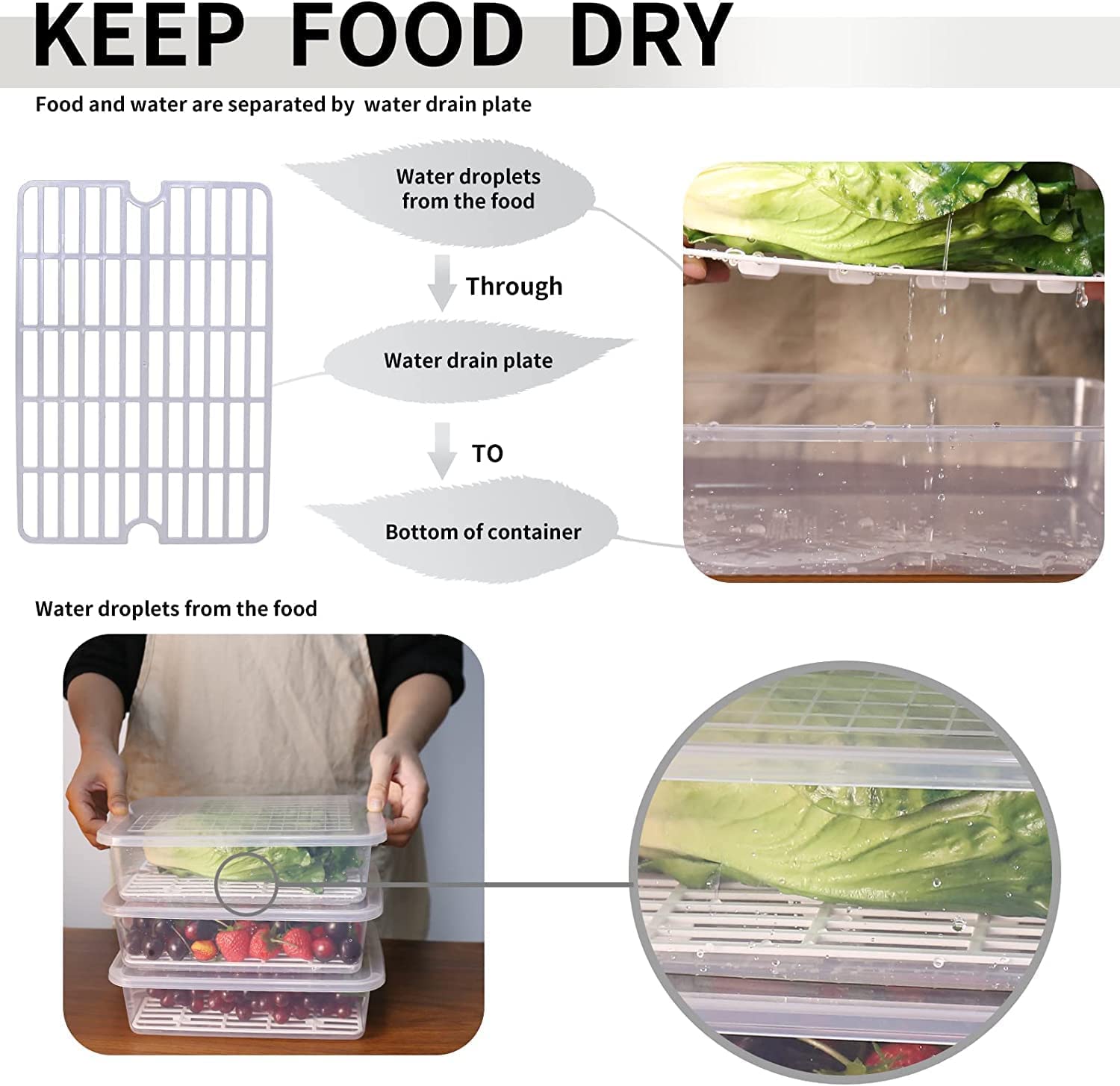 DRAIN PLATE DESIGN :The Fridge containers come with a Removable drain plate which is an added advantage to keep the moisture away from the food which helps in keeping the fruits & vegetables, Fish, Meat, etc fresh all over the long durations. Effective to prevent bacterial growth. Add the lid, prevent odors and keep your food dry and original.