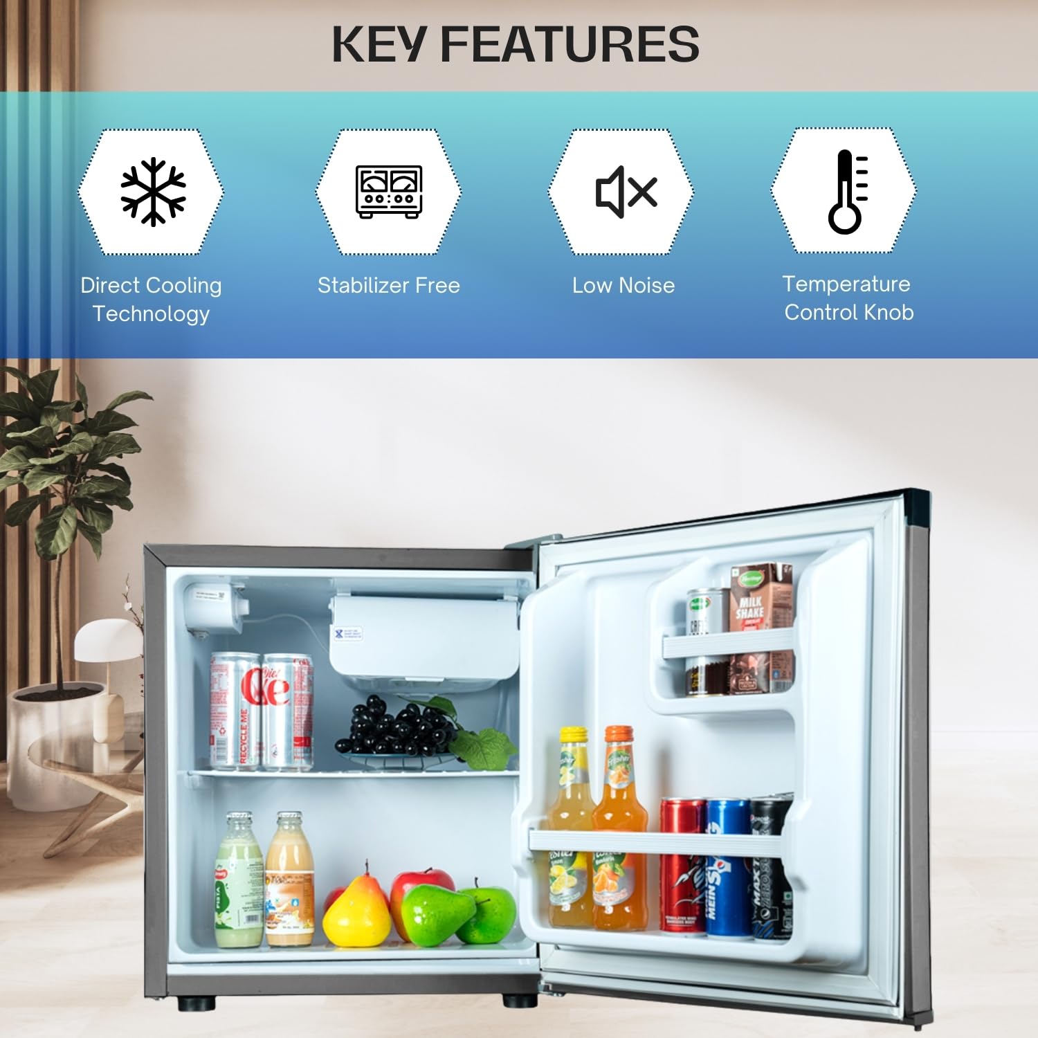The size of fridge is compatible for students office , sufficient cooling space , worth for money, good inner light , good working situation don’t make noiseI am happy with it as it is what i needed for my small kitchen