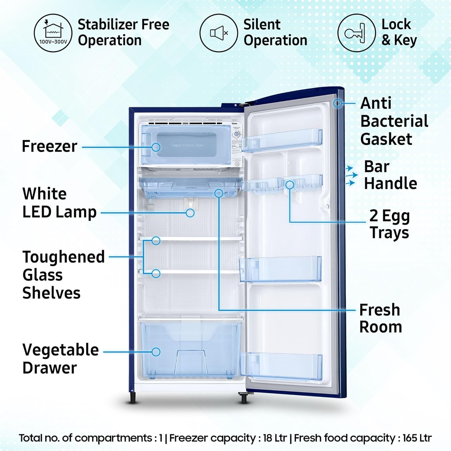 Interior Description : Fresh Food Capacity : 165 Ltr | Freezer Capacity : 18 Ltr | Total no. of compartments : 1 | Shelves : 2 | Vegetable Drawers : 1 | Shelf Type : Toughened Glass Shelves | Anti Bacterial Gasket