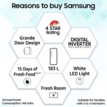 Samsung Exclusive Features : Fresh room | Grande Door Design | Stabilizer Free Operation (100v – 300v) | Smart Connect Inverter (Automatic) | Up to 15 Days of Fresh Food | Bar Handle | Lock & Key