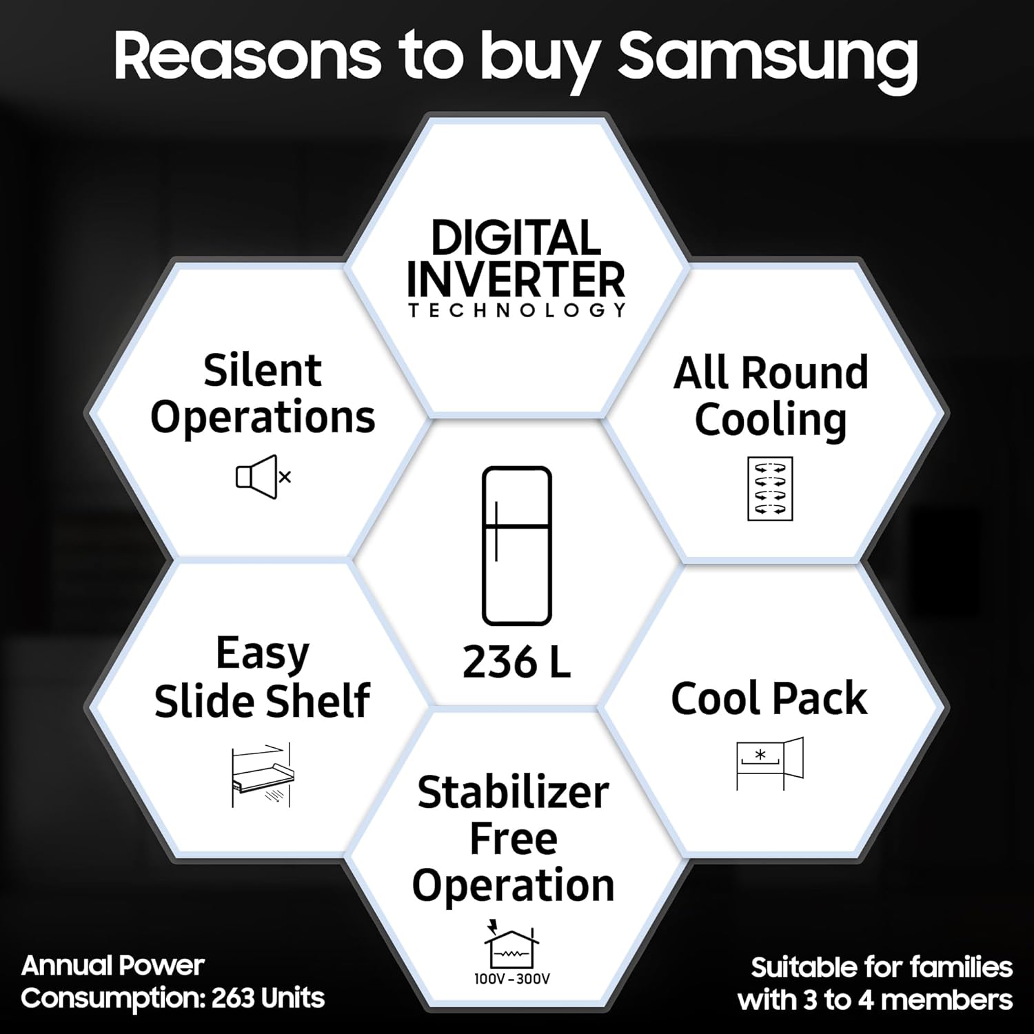 Samsung Exclusive Features : Power Cool | Fresh room | Easy Slide Shelf | All Round Cooling
