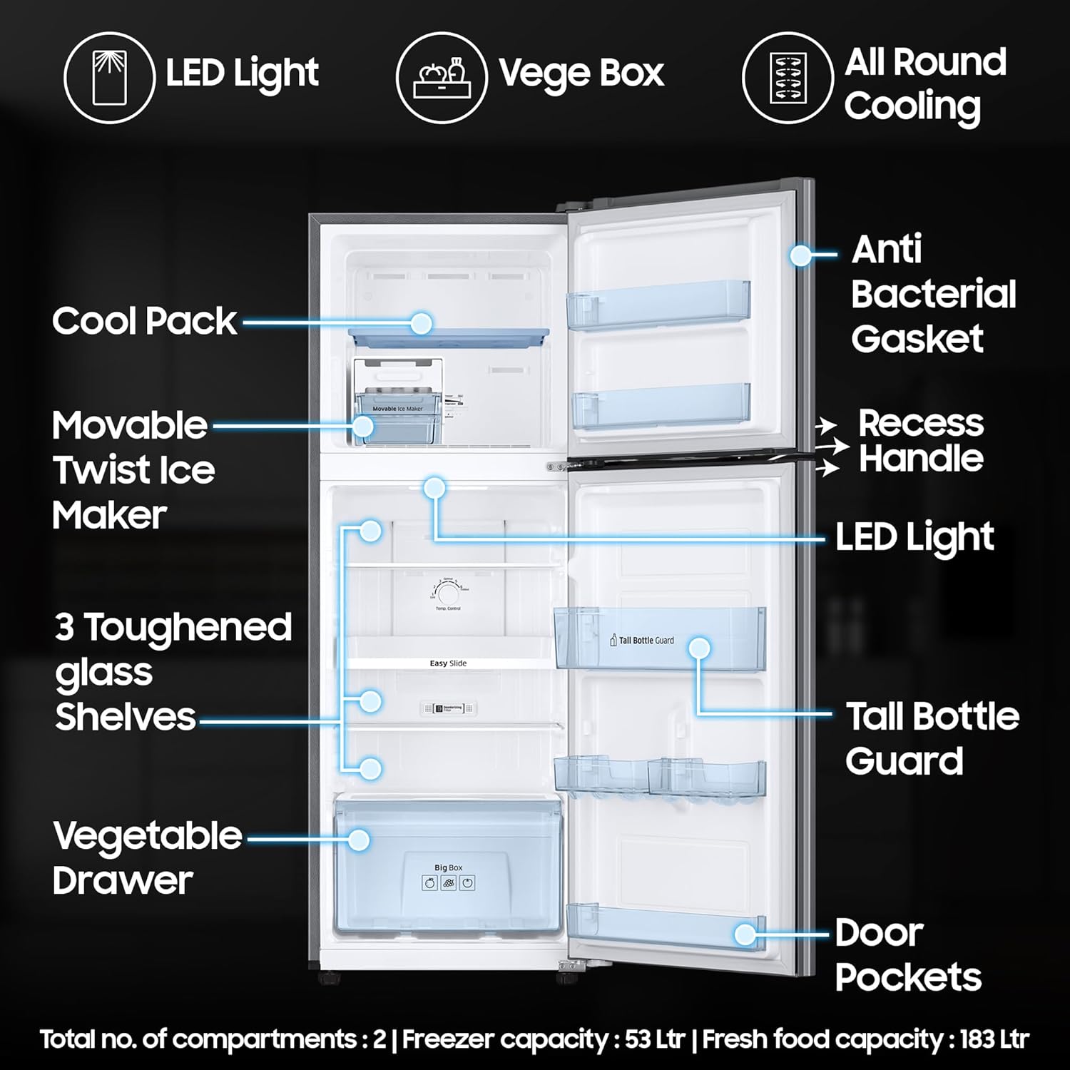 Interior Description : Fresh Food Capacity : 183 Ltr | Freezer Capacity : 53 Ltr | Total no. of compartments : 2 | Shelves : 2 | Vegetable Drawers : 1 | Shelf Type : Toughened Glass Shelves | Anti Bacterial Gasket | Temperature Control : External