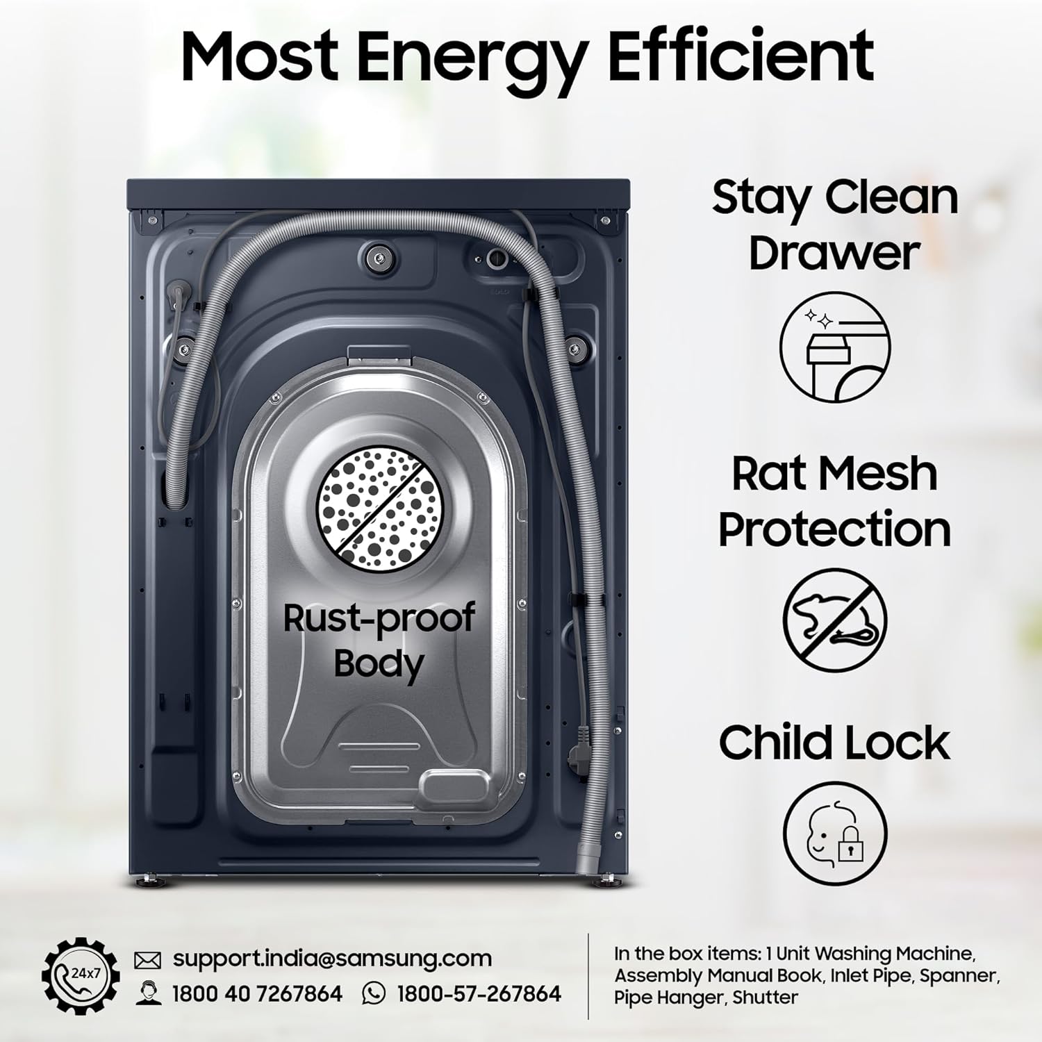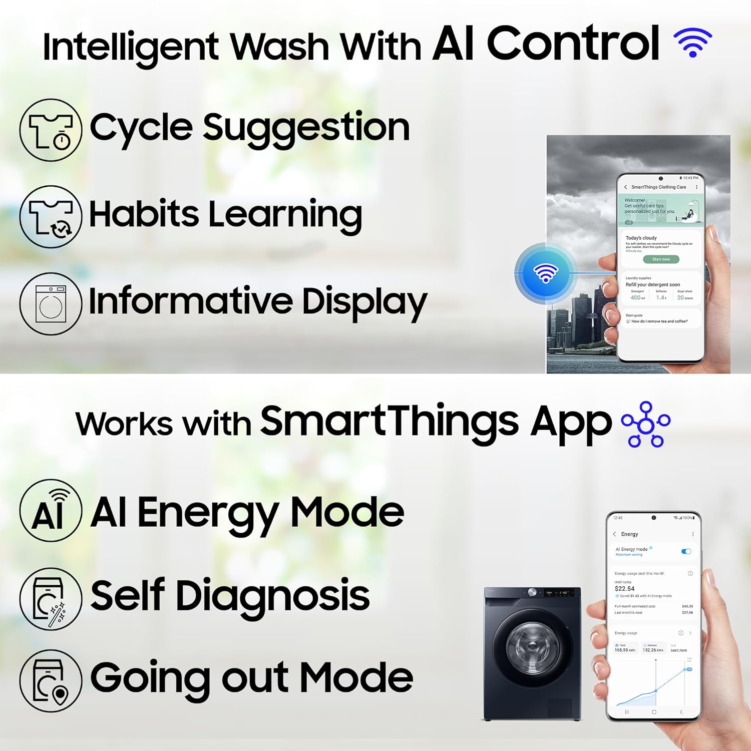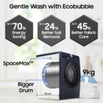 Key Performance Features: AI Ecobubble with 45% better fabric care| AI Energy Mode for up to 70% energy savings | AI Control | Wi-Fi Embedded – Operate remotely| Smartthings for home integration| Hygiene Steam| Super Speed – Wash is just 39 minutes | SpaceMax – Creates more space inside to incorporate a larger drum| Quick Wash| Bubble Soak| Drum Clean+ Removes dirt and 99.9% of odor-causing bacteria| Pre Wash| In-built Heater for Hot & Cold wash