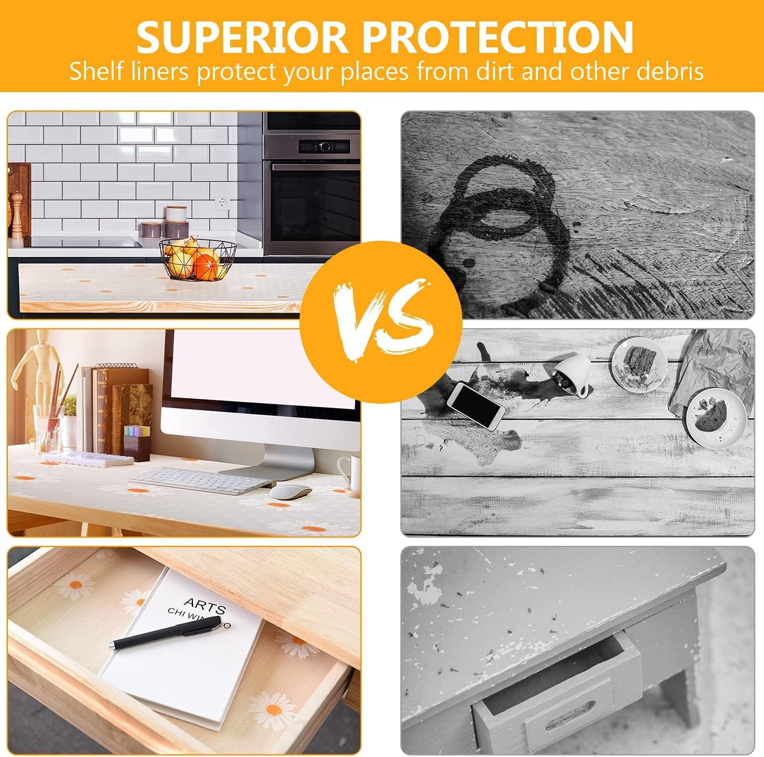 【Easy to Install & DIY】: Our kitchen cabinet liner is very convenient to use, you can easily cut out the size you need with scissors or DIY into various patterns you want, not only to protect the drawer or table surface, but also to decorate the house. Is the best choice for home life.