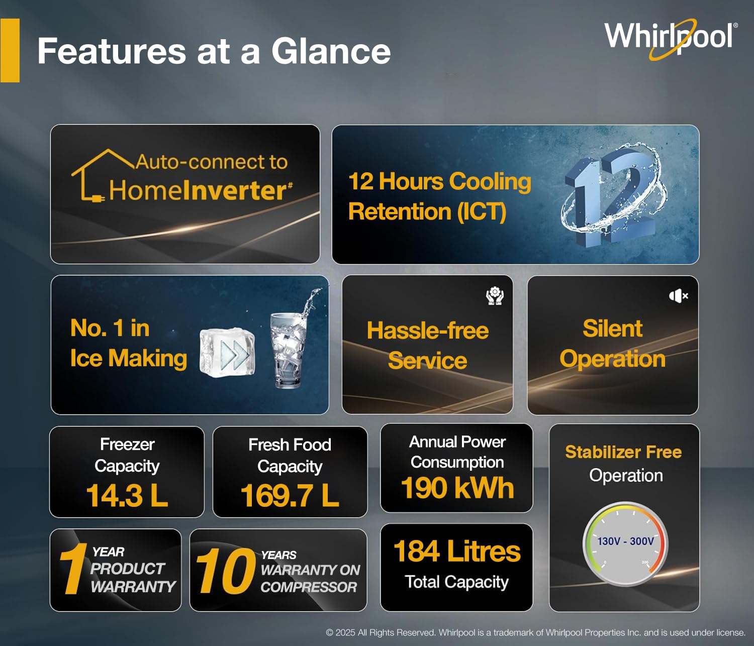 Brand Specific Features – Jumbo Storage for Bottles, Insulated Capillary Technology, Auto Connect To Home Inverter, Large Vegetable Crisper, Honey Comb Lock In Technology, Easy Manual Defrosting & Large Freezer Capacity, Stabilizer free operations (130V-300V)