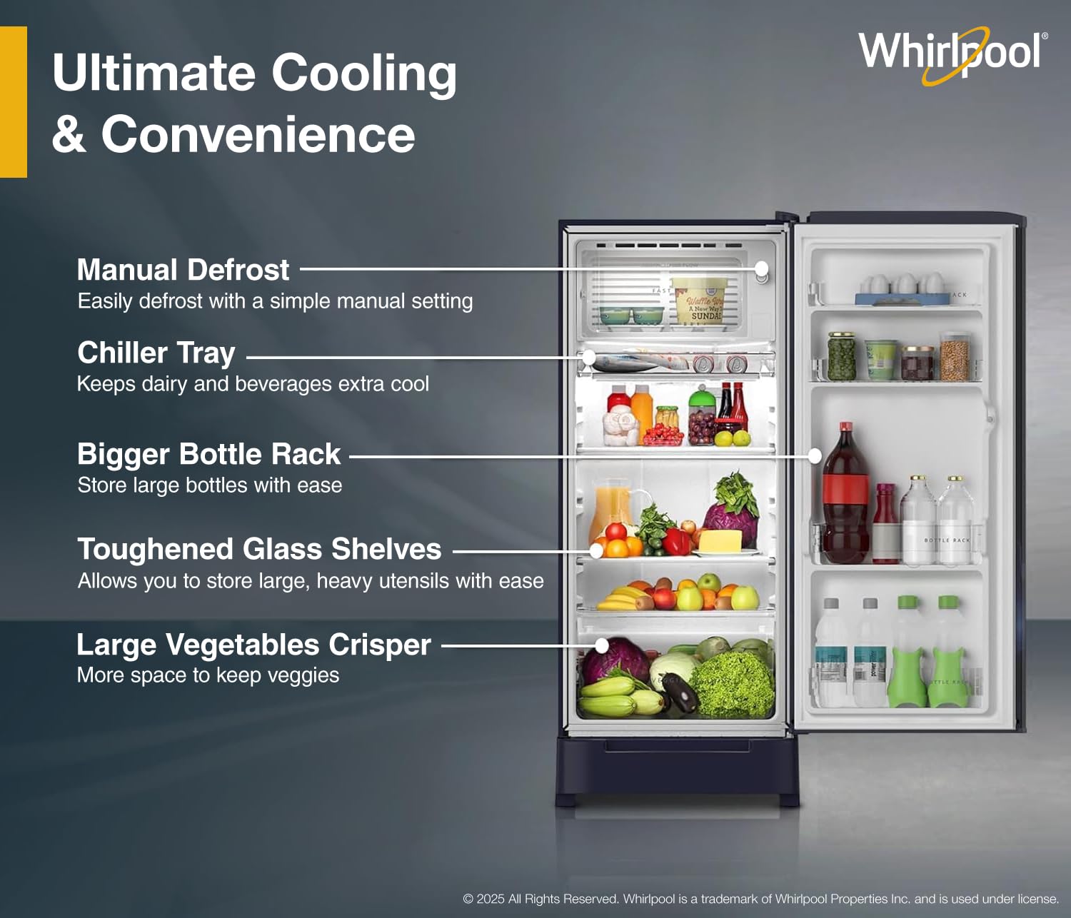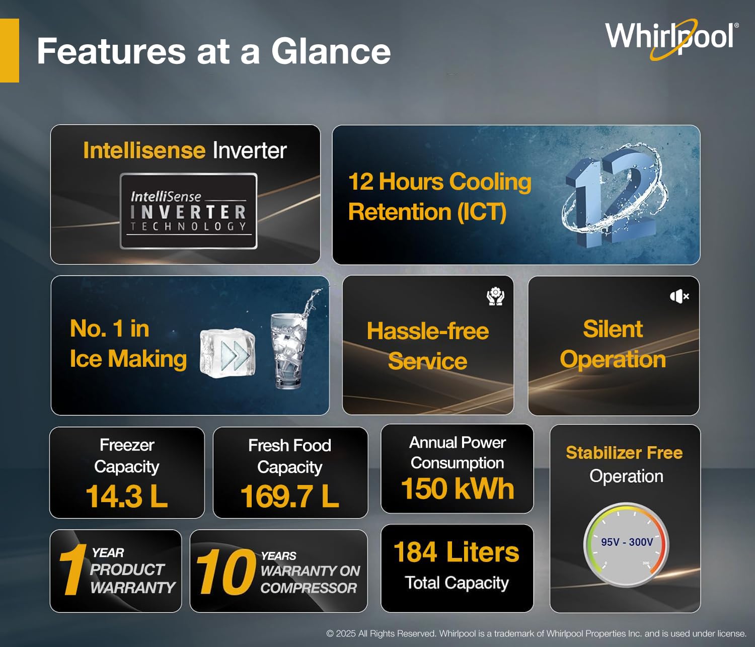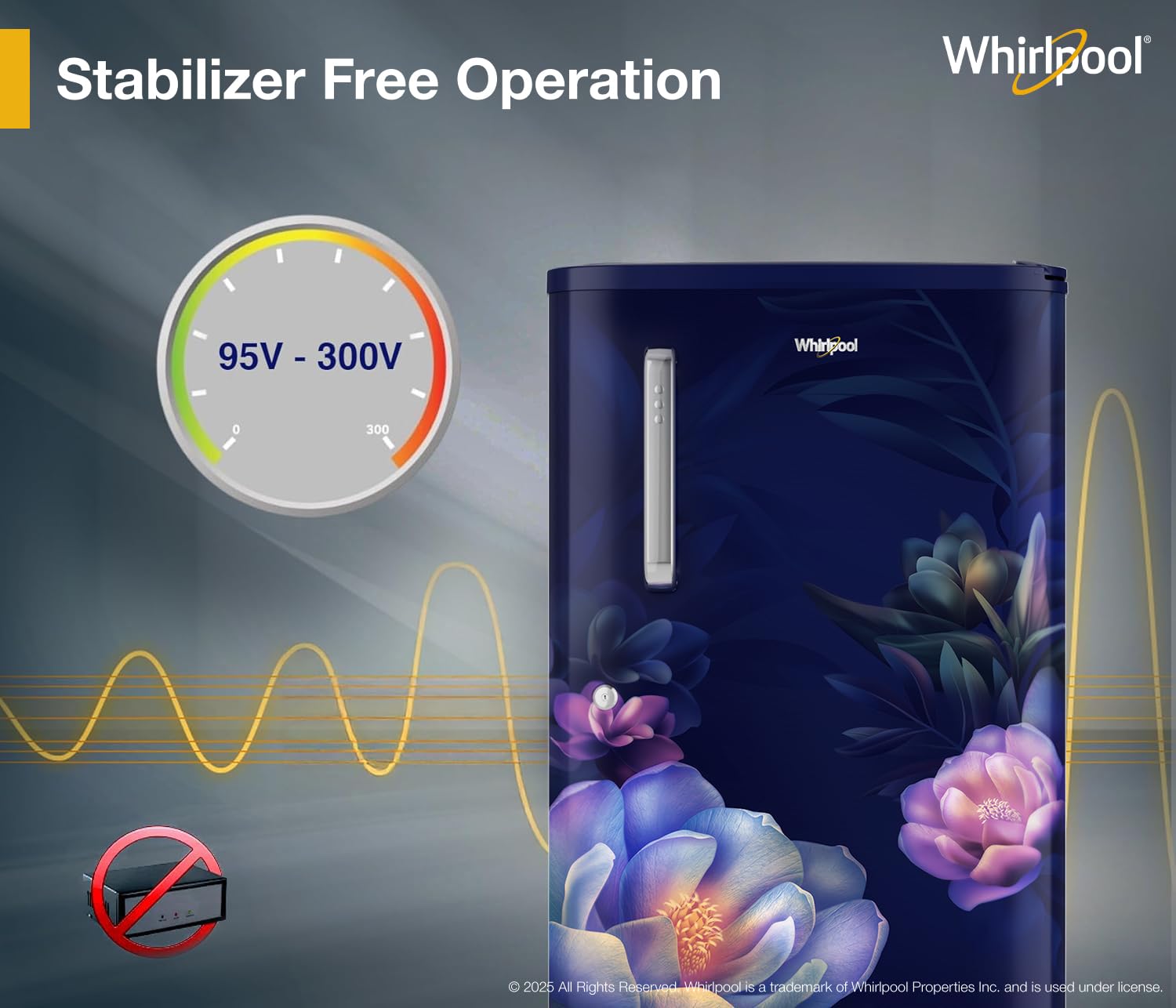 Whirlpool Refrigerators can stably operate even in high fluctuation of voltage (95V-300V) and do not require a separate stabilizer.