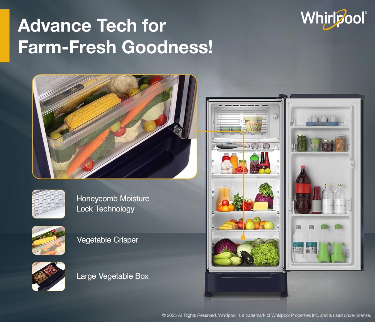 Vegetable crisper with honey comb moisture lock-in technology maintains optimum moisture in your vegetables and keeps them fresher for longer.