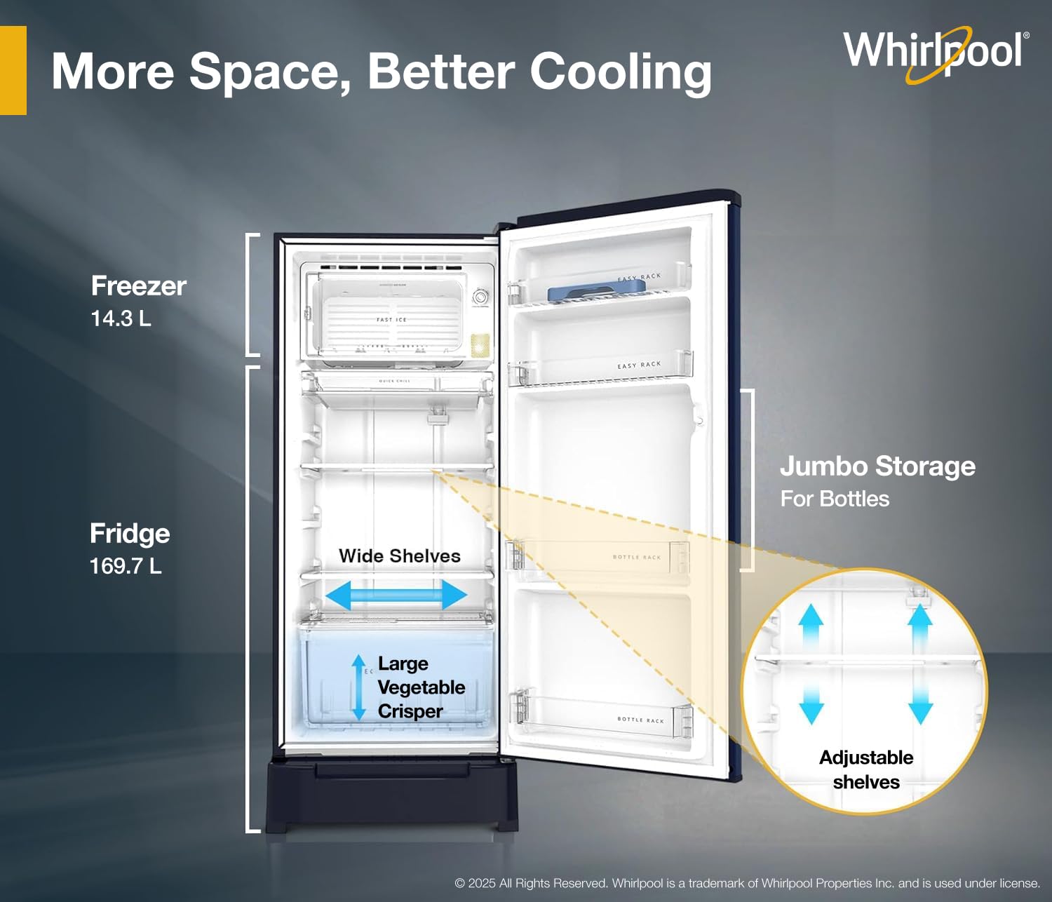 Storage & Interior Description – Fresh food capacity : 169.2 Ltr | Freezer capacity : 14.3 Ltr