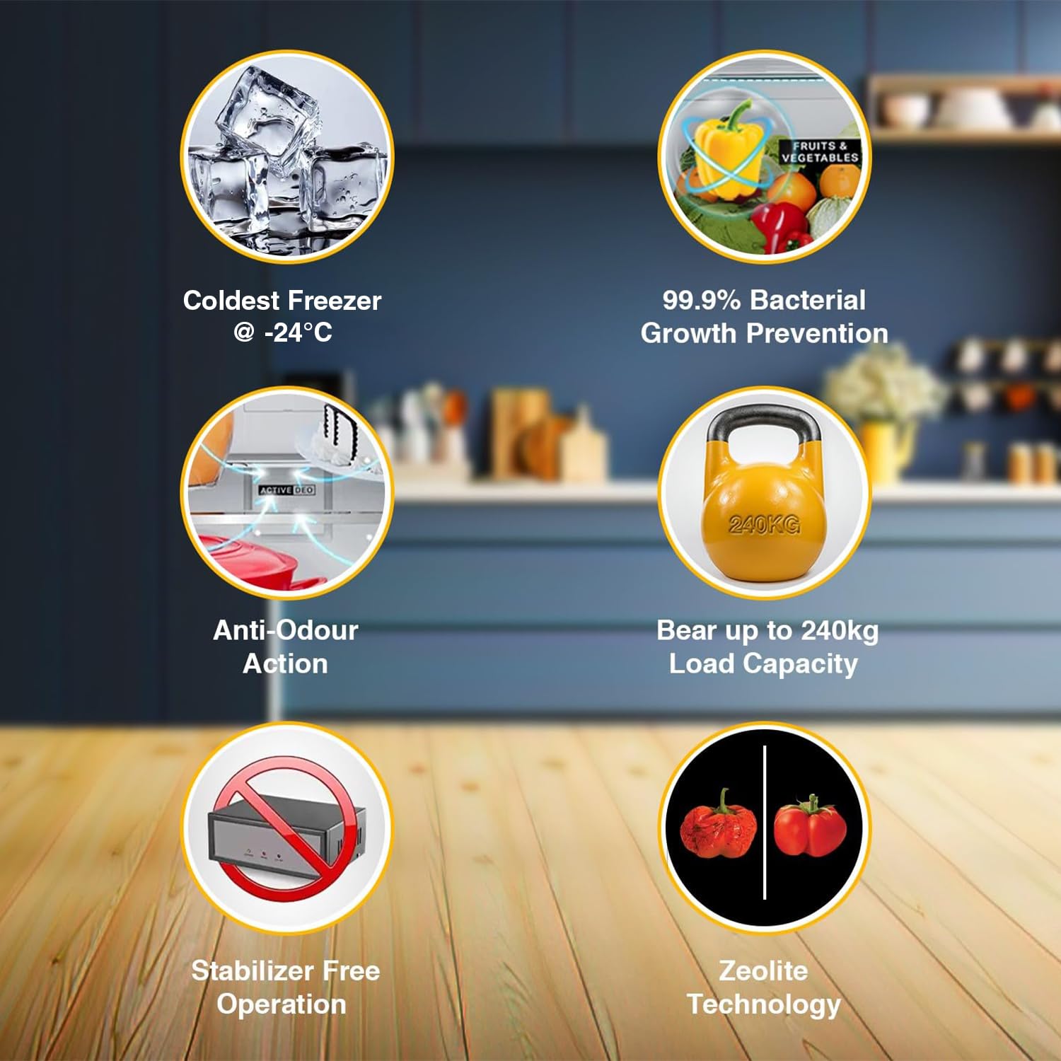 Brand Features : Knob Inside Refrigerator, Get Ice In Up 85 Minutes, 40% Faster Bottle Cooling, Anti-Odour Action, Coldest Freezer As -24C, 99.9% Bacterial Growth Prevention, Inverter