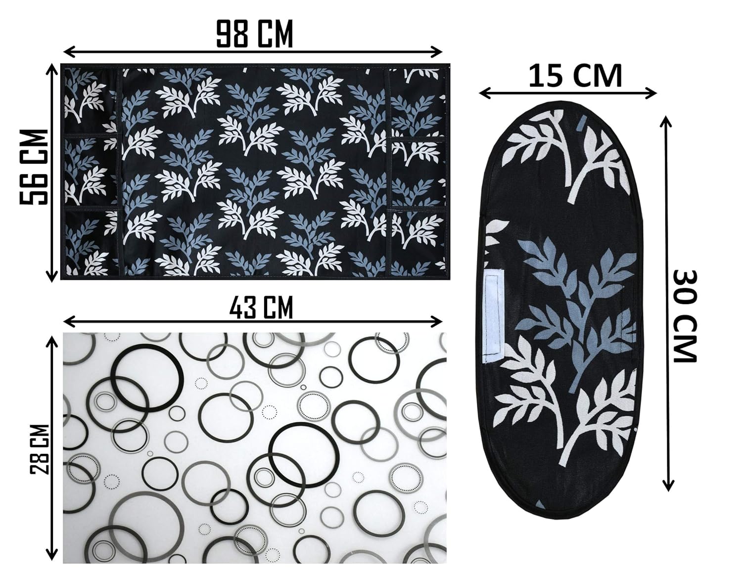 Content – 4 pieces of mat, Fridge Top Cover & 2 Handle Cover, Material : Fabric and PVC, Color- Black
